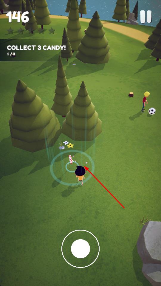 1、“任务挑战”,操控卡通小人,在森林场景完成任务:收集3颗糖果(CANDY)、摧毁5棵树(TREES)。