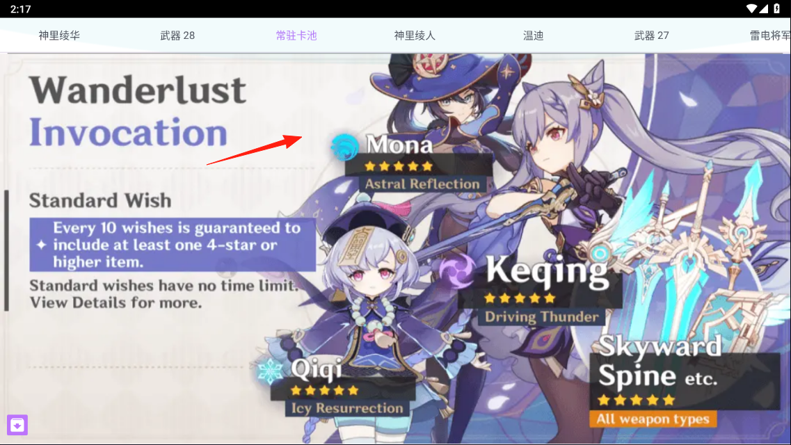 3、在常驻卡池界面,查看可抽取角色了解“每10次祈愿必出4星及以上”规则,选择祈愿次数,借常驻池无时间限制、保底机制,体验长期收集角色的玩法,感受养成的持续性。