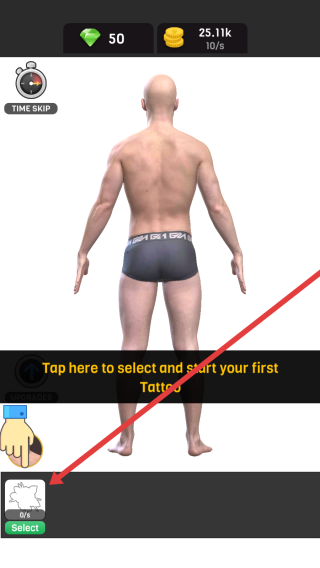 2、在人物界面,点击下方纹身图案【Select】,选择首个纹身,消耗资源,开始为角色定制纹身。