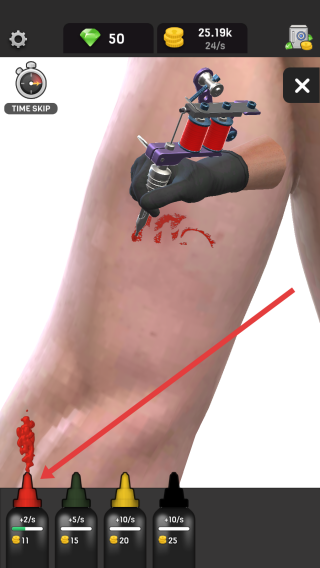 3、纹身操作时,按箭头选红色颜料(+2/s),为顾客腿部纹身,控制纹身机,完成图案绘制流程。