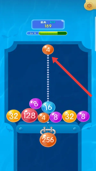 3、合成时,需要瞄准箭头指向的数字球(如4),发射同数字球,合并升级,冲击更高分数。