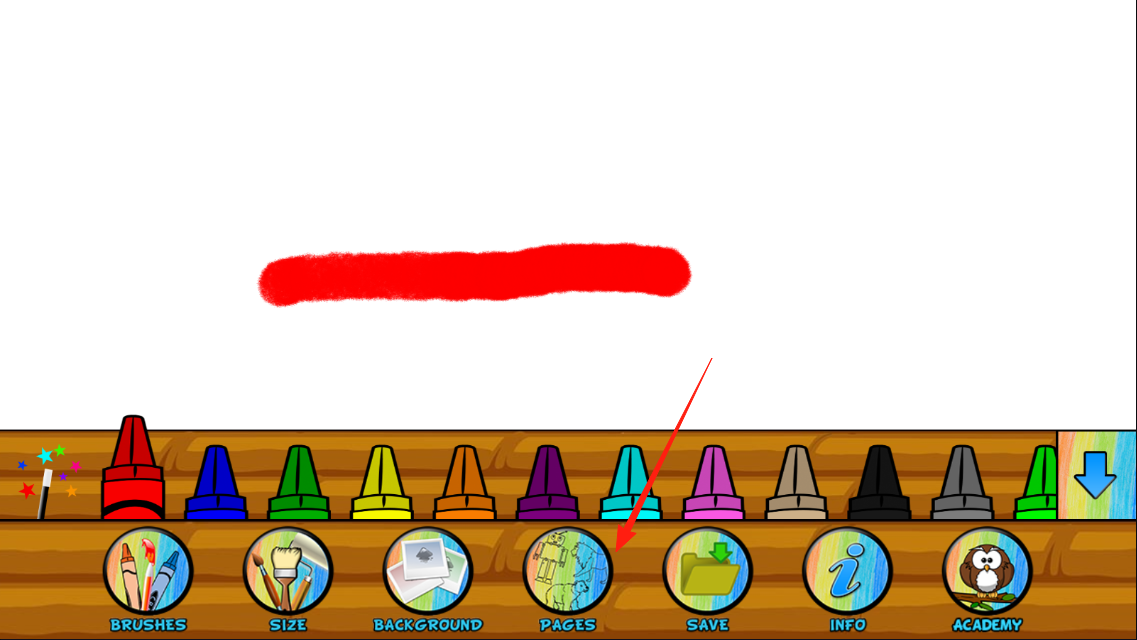 2、用红色蜡笔绘制后,点击“PAGES”按钮,进入页面选择界面,可切换不同绘画页面,尝试在新画布创作,借页面切换机制,拓展创作空间,体验多场景绘画的玩法变化。