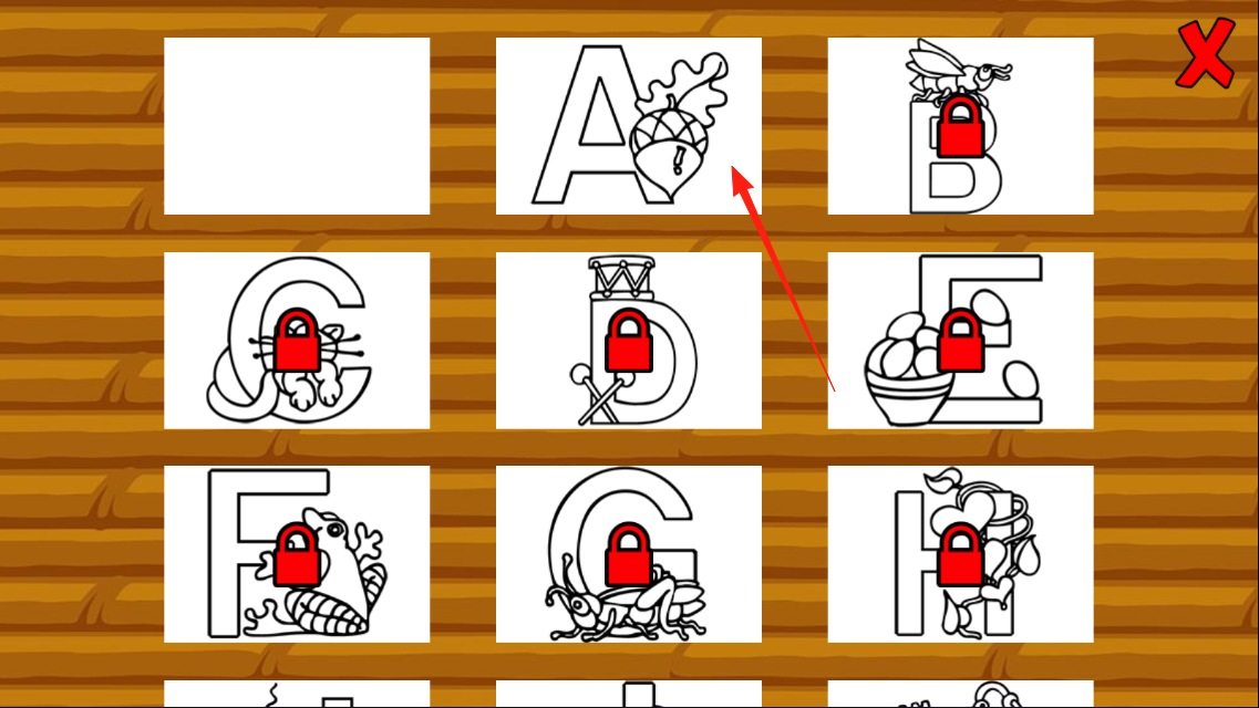 3、在“PAGES”界面,选择带“A”字母的图案页,进入填色关卡,需用蜡笔为字母及装饰图案上色,完成特定图案的色彩填充,体验有目标的绘画挑战,感受创意与任务结合的玩法。