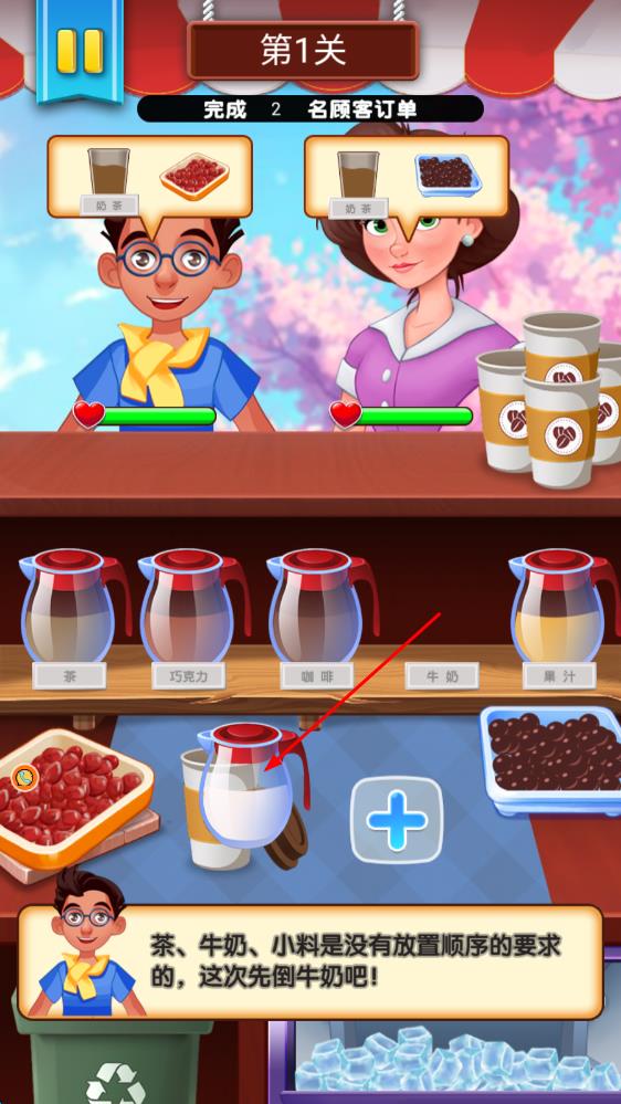 1、刚开启奶茶店生涯,先熟悉各种原料的特性,面对第一位顾客的订单,仔细挑选原料,按步骤一步步调制出符合要求的奶茶。