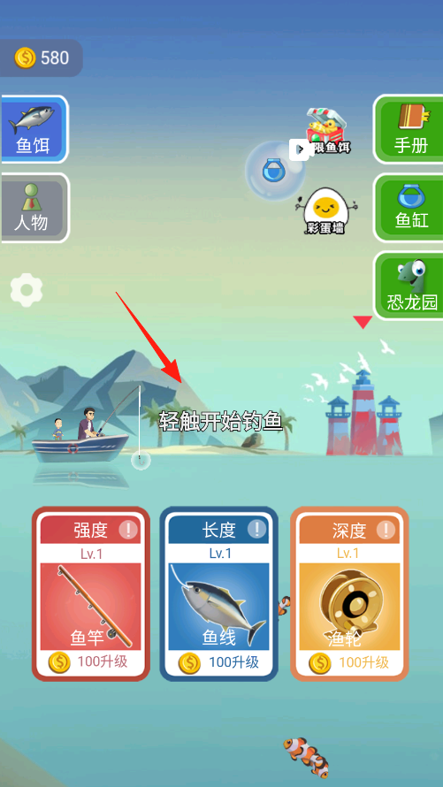 1、在主界面,点击“轻触开始钓鱼”,确认鱼竿、鱼线等装备,消耗金币可升级提升属性。