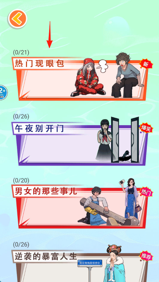 1、在关卡列表,点击“热门现眼包”,进入对应剧情,准备通过互动解谜推进故事。