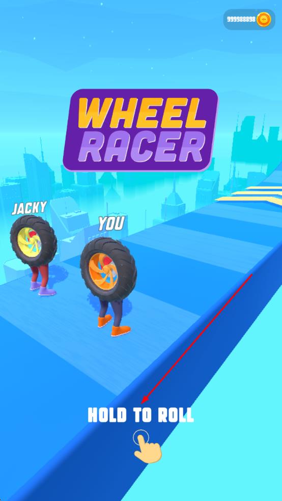 1、点击【HOLD TO ROLL】,操控角色在赛道滚动,与【JACKY】竞技,开始【WHEEL 】挑战。