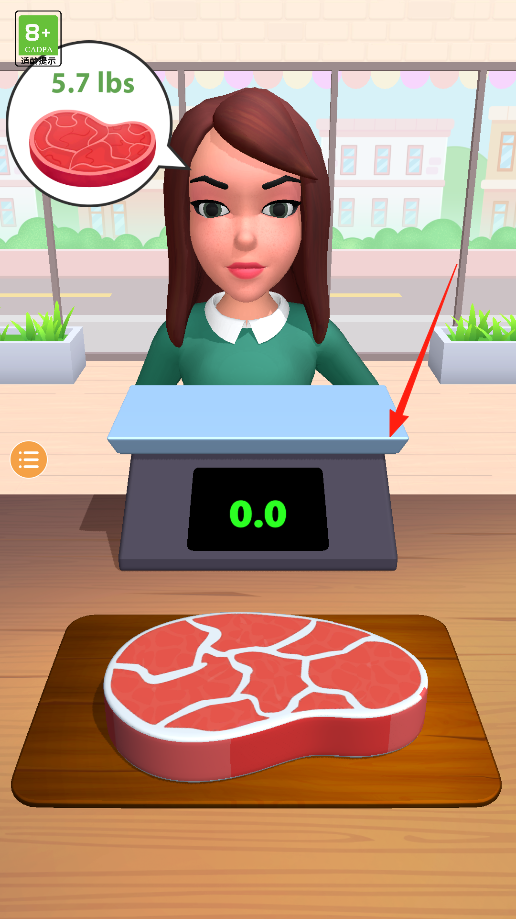 1、进入称重游戏场景,顾客需求是5.7lbs的肉,将砧板上的生肉放到电子秤(箭头指向),开始称重流程,借放置操作启动称重,感受玩法的目标性。