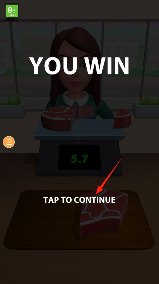3、当电子秤显示5.7,达成顾客需求,触发“YOU WIN”,点击“TAP TO CONTINUE”,进入下一关或结算,体验目标达成后的流程推进,感受玩法的闭环性。