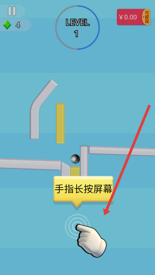 1、在第1关,需要按提示“手指长按屏幕”,通过控制小球移动,完成关卡,学习基础操作。