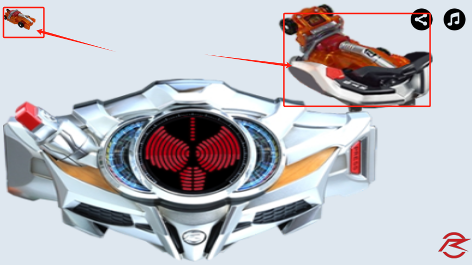 3、腰带配件特写里,橙色小车是变身道具,将其放置到对应位置可触发特定变身形态;黑色部件是载具连接装置,用于模拟剧中与载具联动的变身场景。