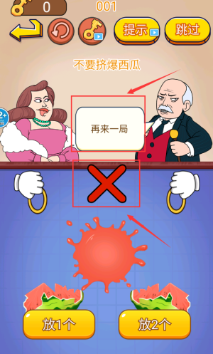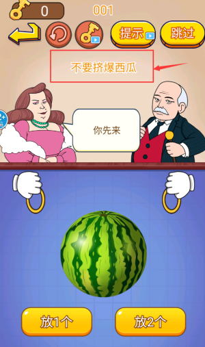 2、选择放1个西瓜,避免挤爆完成挑战。