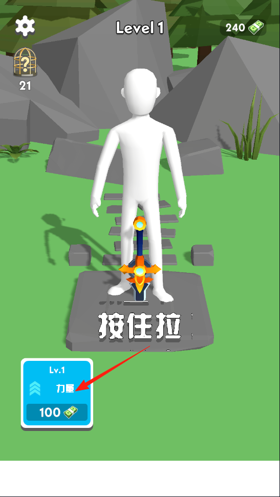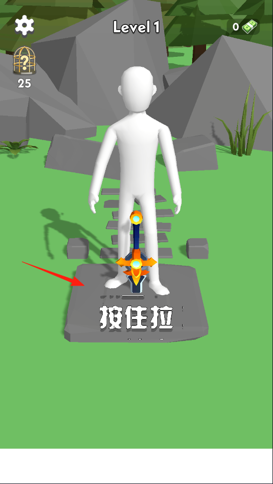 1、进入第1关,看到角色站在剑旁,屏幕显示“按住拉”,长按对应区域,尝试拔出剑,借长按交互机制,开启挑战,体验力量博弈的初始玩法,感受操作与反馈的关联。