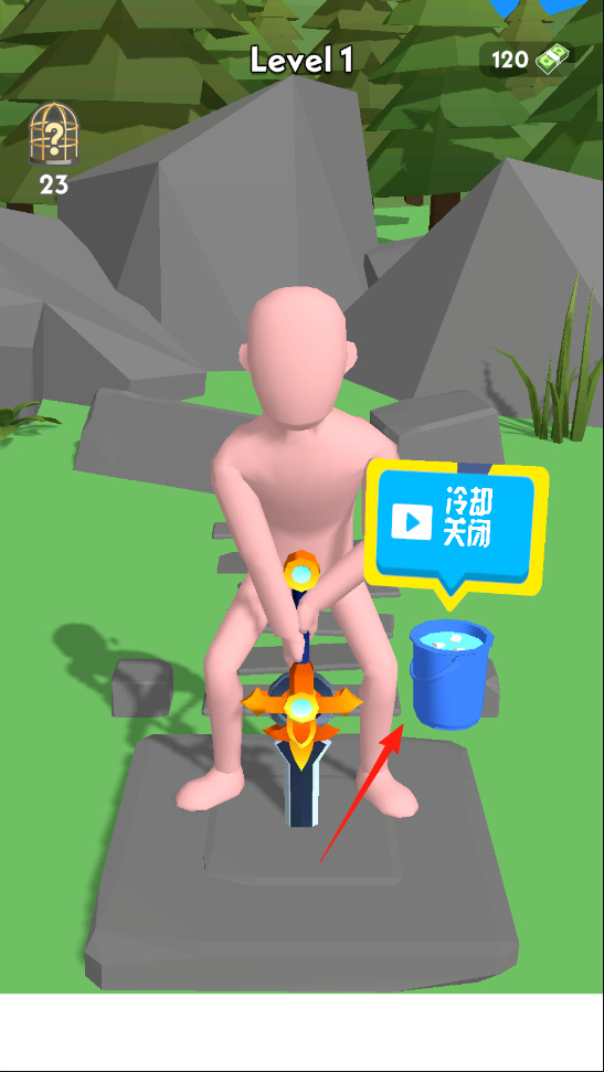 2、拔剑过程中,出现水桶与“冷却关闭”提示,可选择观看广告关闭冷却,或继续拔剑,借广告交互机制,优化拔剑条件,体验玩法的策略选择,感受资源与玩法进程的结合。