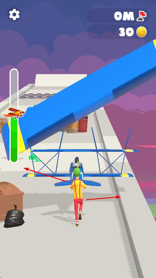 1、“角色跑酷”,操控小人沿跑道前进,躲避障碍,收集飞机部件(齿轮、机翼)。