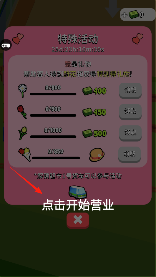 1、在特殊活动界面,点击“点击开始营业”,需帮助客人获取鲜花,积累数量兑换奖励,借活动启动机制,开启营业流程,体验任务驱动的玩法,感受奖励兑换的目标性。