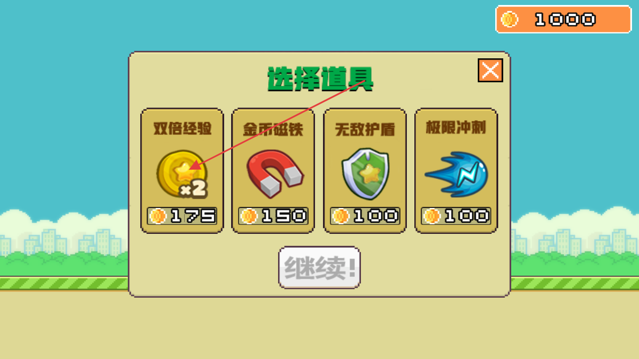 1、在初始界面点击开始按钮,进入游戏可在“选择道具”界面,用金币选购“双倍经验”“金币磁铁”等道具,助力闯关。