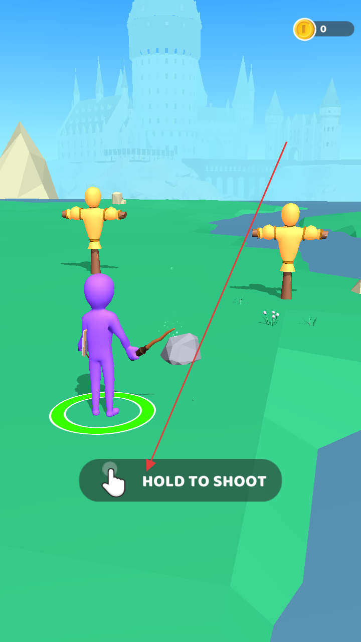 1、进入魔法场景,角色站在绿色圆环内,界面显示“HOLDTOSHOOT”,长按对应按钮,蓄力施展魔法射击。