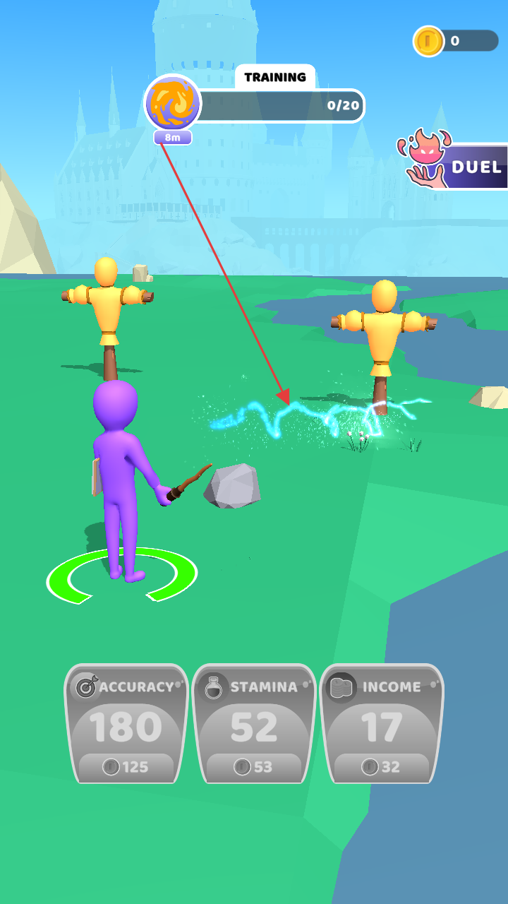 2、瞄准黄色稻草人目标,释放魔法(如闪电)命中后,上方“TRAINING”进度更新,同时积累金币。