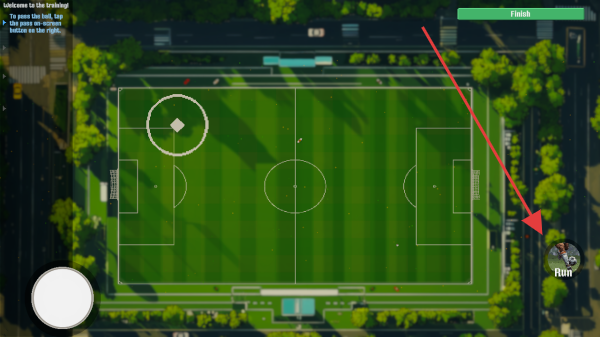 3、找到足球后,点击右下角【Run】键加速,操控角色带球,按照游戏提示(如将球踢到右侧圆圈)完成任务,点击【Finish】提交,解锁新关卡。