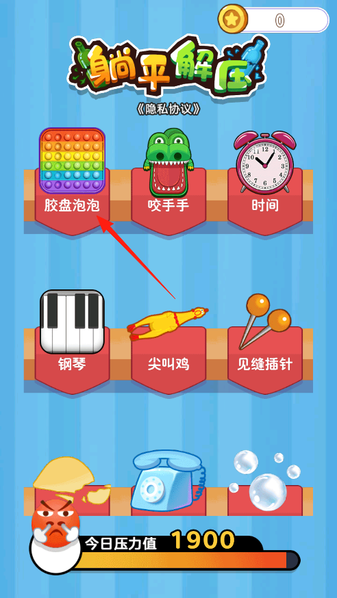 1、打开躺平解压游戏主界面,点击“胶盘泡泡”选项,进入对应解压玩法,借选择机制,开启彩虹泡泡盘的按压体验,用点击操作释放压力,感受视觉与触觉结合的解压乐趣。