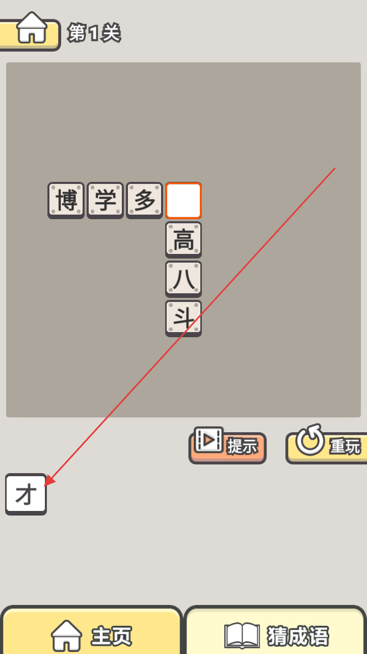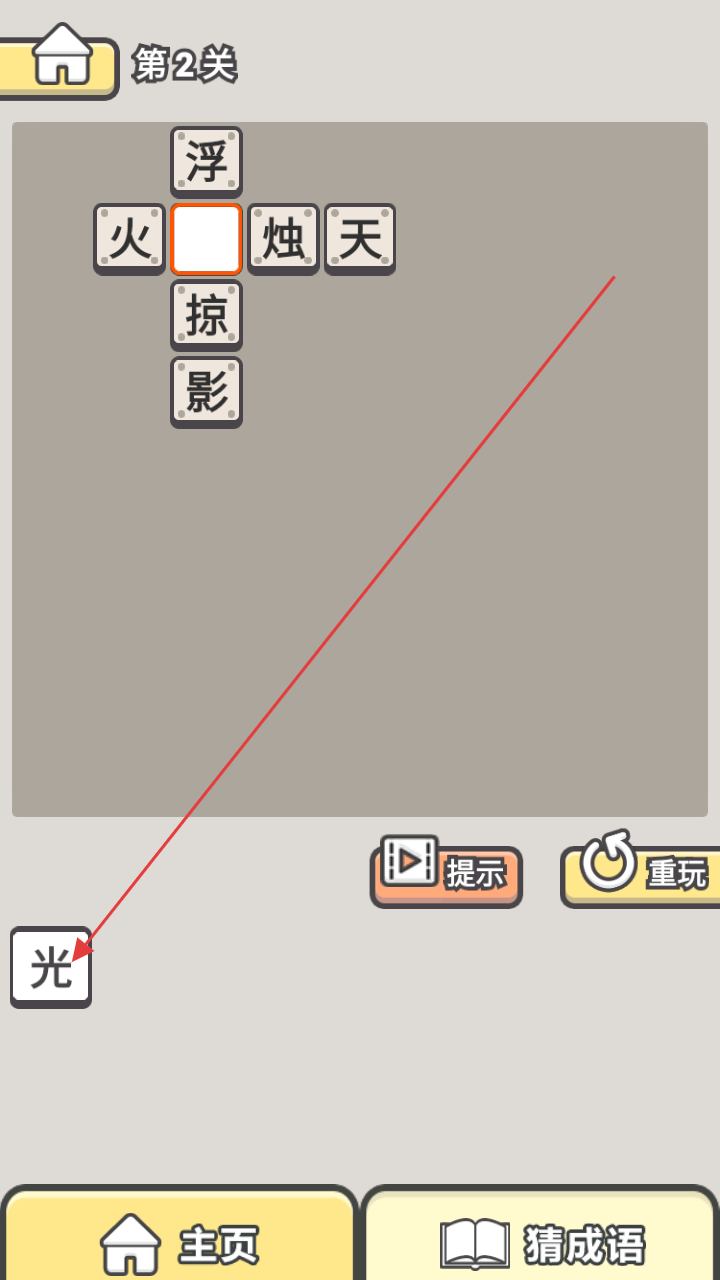 1、进入游戏后,选择关卡开始挑战。在每一关的游戏界面中,会呈现出由多个汉字方块组成的成语拼图,其中部分方块缺失。