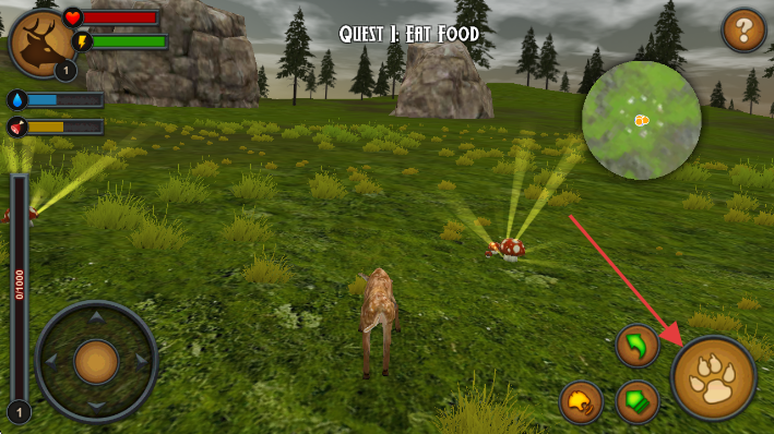 2、靠近发光食物(如蘑菇),点击右侧爪印图标,完成“Eat Food”进食任务。