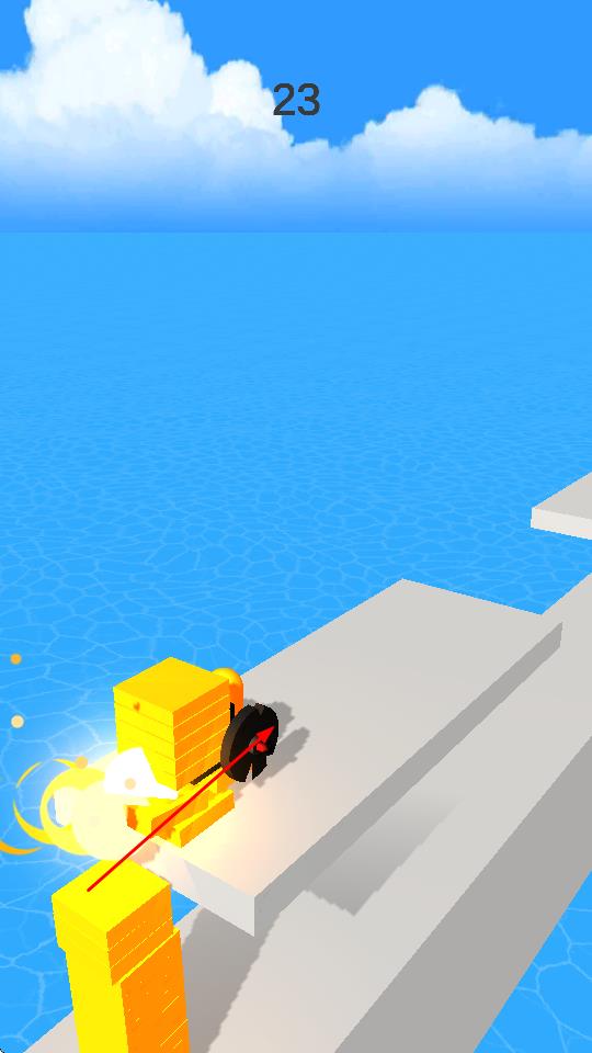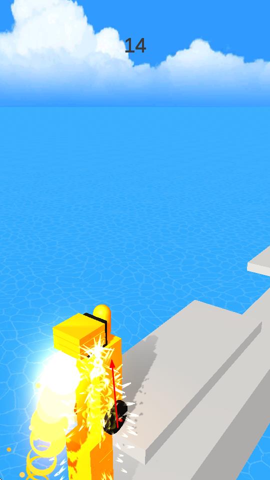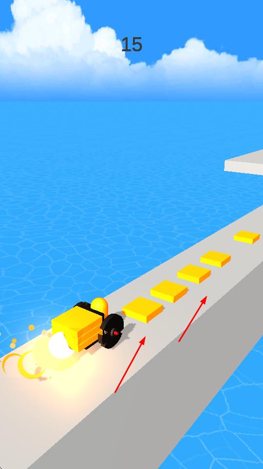 2、“跑酷前进”,跟随红色箭头指引,利用堆叠的积木跨越跑道缺口,保持前进节奏,避免掉落水中。