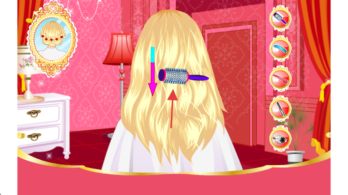3、用右侧美发工具(卷发棒等),按箭头指引操作,设计公主辫子发型。