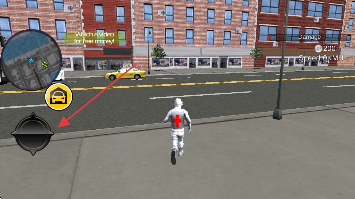 1、左侧虚拟摇杆操控角色,靠近黄色汽车图标,切换为救护车驾驶模式。
