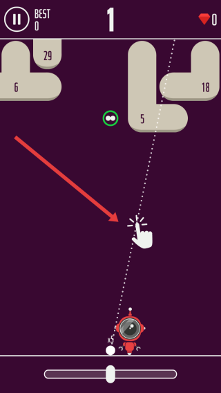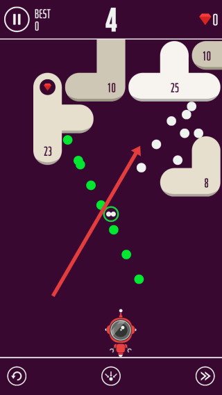 2、游戏中,按箭头指引,滑动屏幕调整弹珠发射角度,利用物理弹射,击碎标有数字的砖块,积累分数。