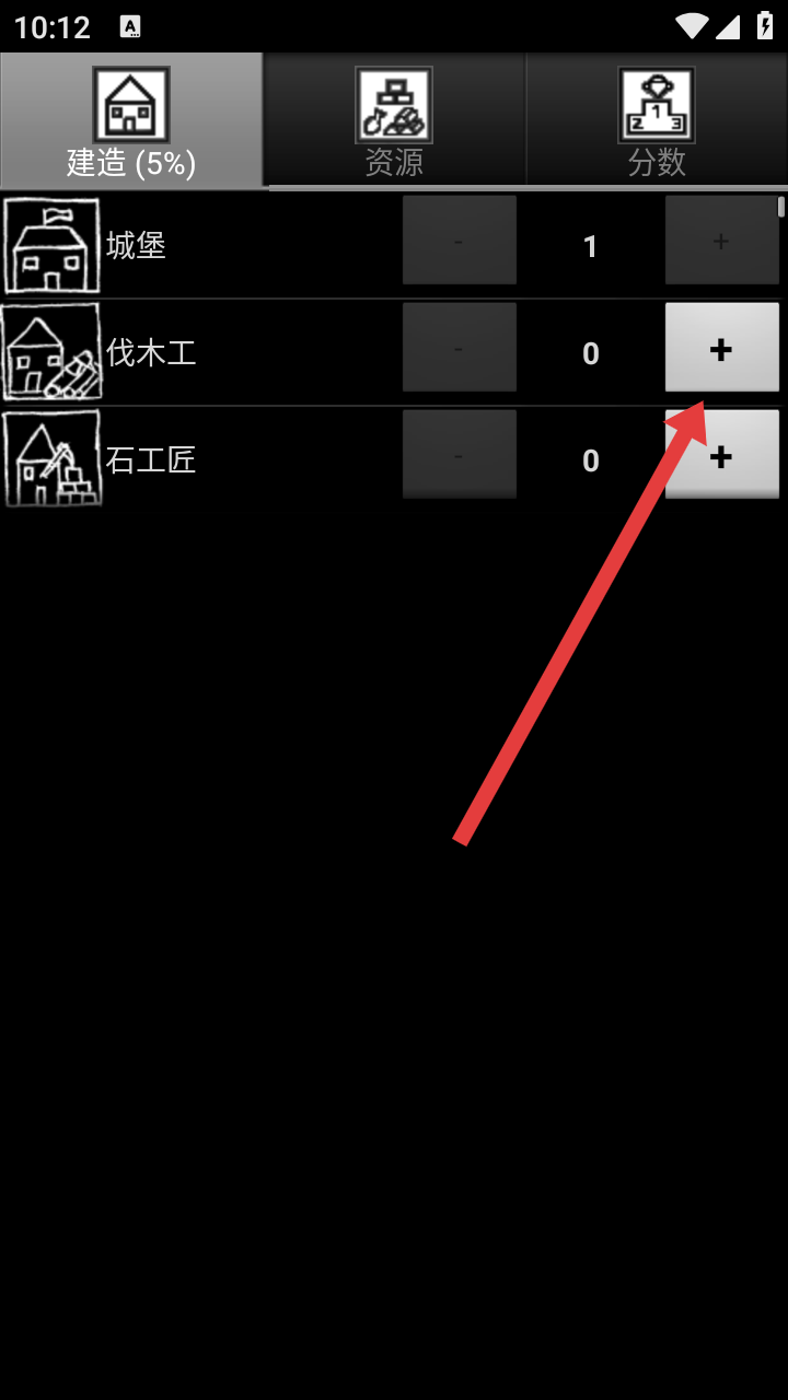 1、在建造游戏的界面,点击【伐木工】右侧的【+】,解锁伐木工建筑,推进建造进度(从5%升至10%)。