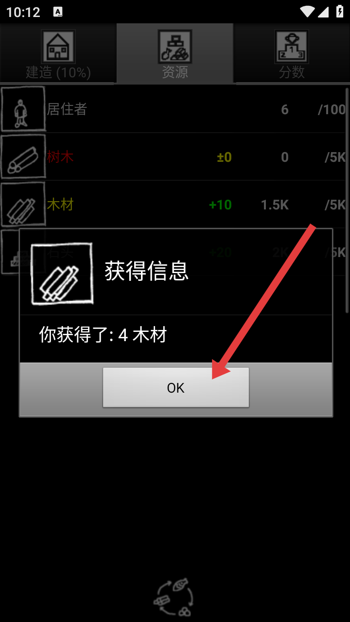 2、获取木材后,需要点击弹窗中的【OK】,如何确认“获得4木材”的信息,关闭提示继续游戏。