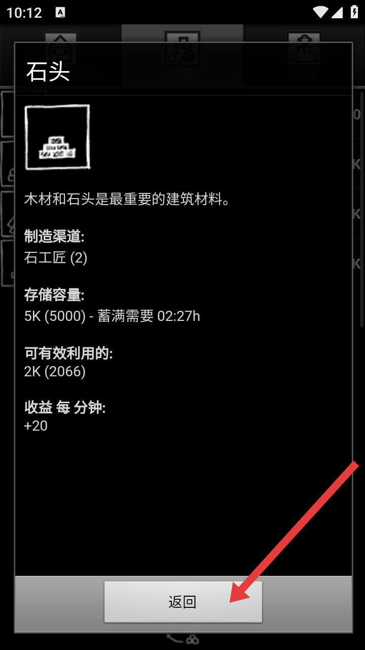 3、在查看石头的游戏资源详情后,点击底部【返回】按钮,退出石头信息界面,回到资源主页面。