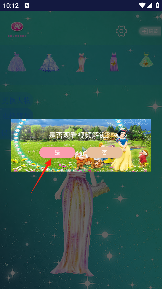 2、若点击未解锁礼服,触发“是否观看视频解锁”弹窗,选择“是”,观看广告后可解锁新礼服,体验资源获取与玩法进度推进的关联,感受解锁新内容的期待。
