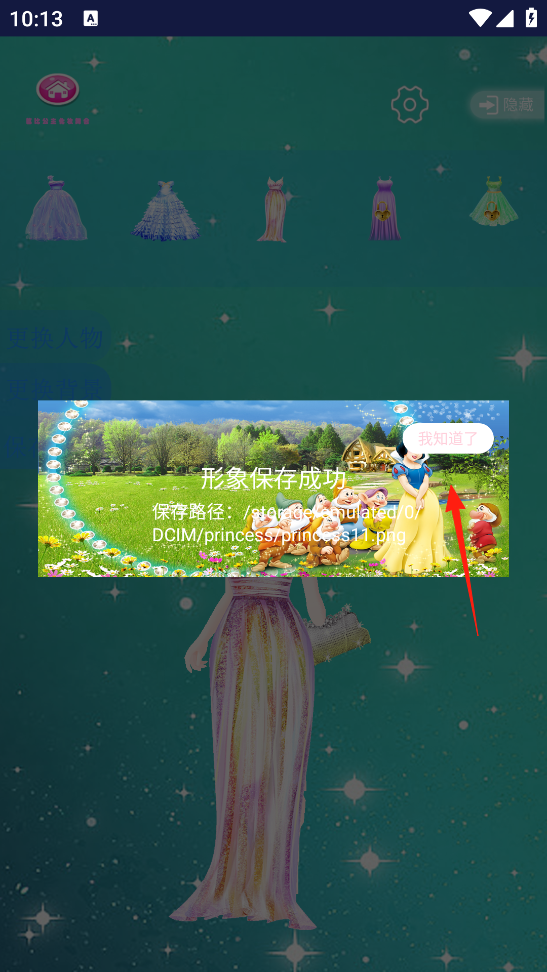 3、成功解锁或搭配新礼服后,触发“形象保存成功”提示,点击我知道了确认,保存公主穿搭形象,体验玩法的完整流程,感受成果留存的满足感。
