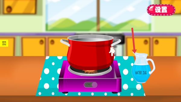 3、烹饪操作:按步骤,点水壶加水、用炉灶煮食,制作美食,解锁新食谱、关卡。