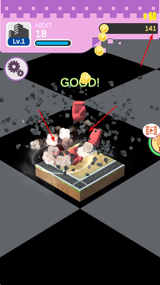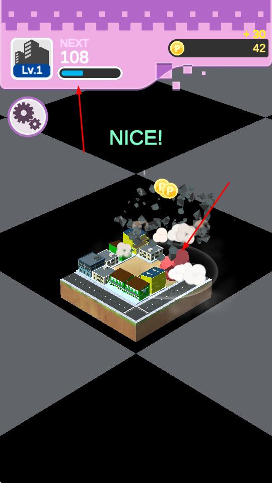 1、“城市摧毁”,在游戏界面点击城市模型,触发摧毁效果,获取金币(42→141→514),推进游戏进度。