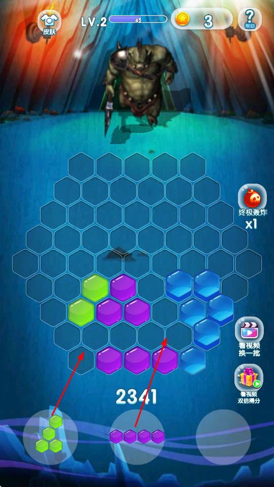 3、“关卡挑战”,完成LV.1后解锁LV.2,面对更强怪兽,合理规划方块布局,积累分数,使用“终极轰炸”道具,快速通关。