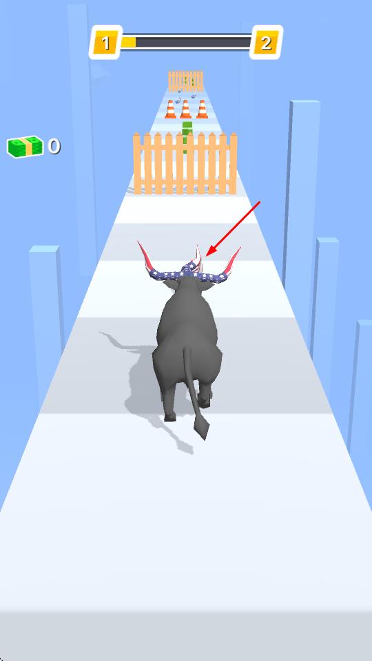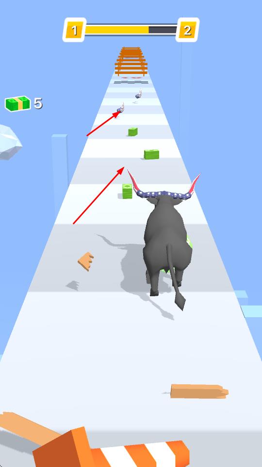 1、“公牛跑酷”,在跑道操控公牛,冲撞栅栏、路障,摧毁障碍,收集钞票(0→5),提升游戏进度。