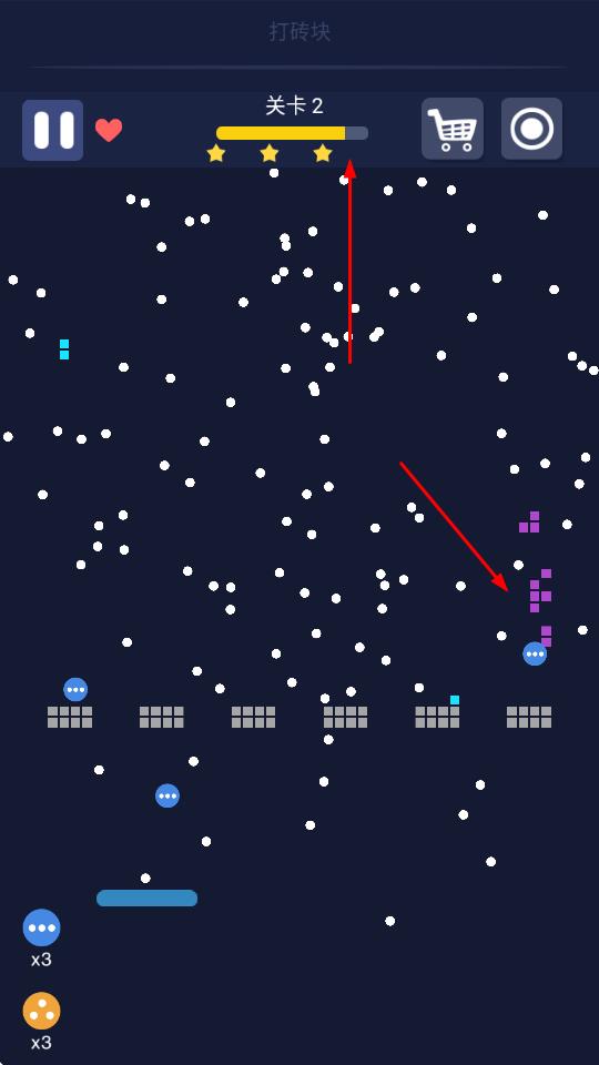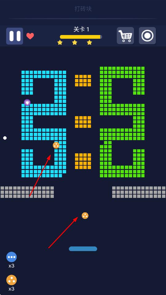 1、发射小球击碎砖块:玩家瞄准砖块发射小球,利用小球反弹击碎更多砖块,在三条命和有限时间内尽可能打破所有砖块,通过调整发射角度提升击碎效率,完成关卡目标。