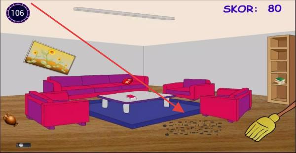 1、注意到客厅地面有污渍(箭头指向处),使用右下角的扫帚工具清扫污渍,获取分数(当前SKOR为80),同时留意左上角倒计时(106),在时间内完成清洁任务。