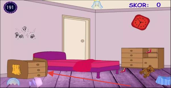 2、进入卧室场景,按照箭头指示,整理物品,如将抽屉归位等,清理墙面上的手印等污渍,使房间整洁,此时SKOR归零,重新积累分数,注意倒计时(191)。