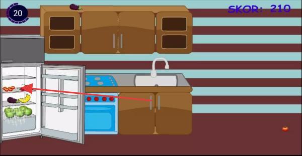3、在厨房场景,点击箭头指向的冰箱内物品进行整理,关闭冰箱门等,保持厨房整洁,提升分数(SKOR达到210),关注倒计时(20),完成关卡任务。