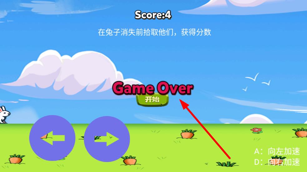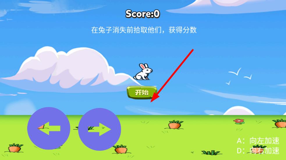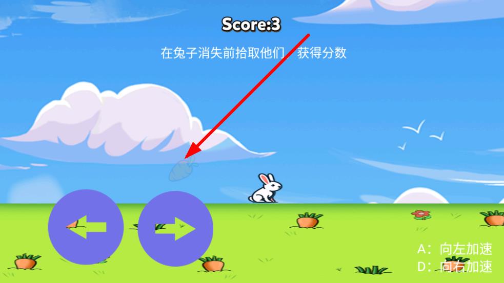 1、进入游戏后,在初始关卡控制兔子左右移动,点击屏幕让兔兔向上跳跃,收集第一个胡萝卜,同时避开地面的尖刺陷阱,熟悉跳跃节奏。