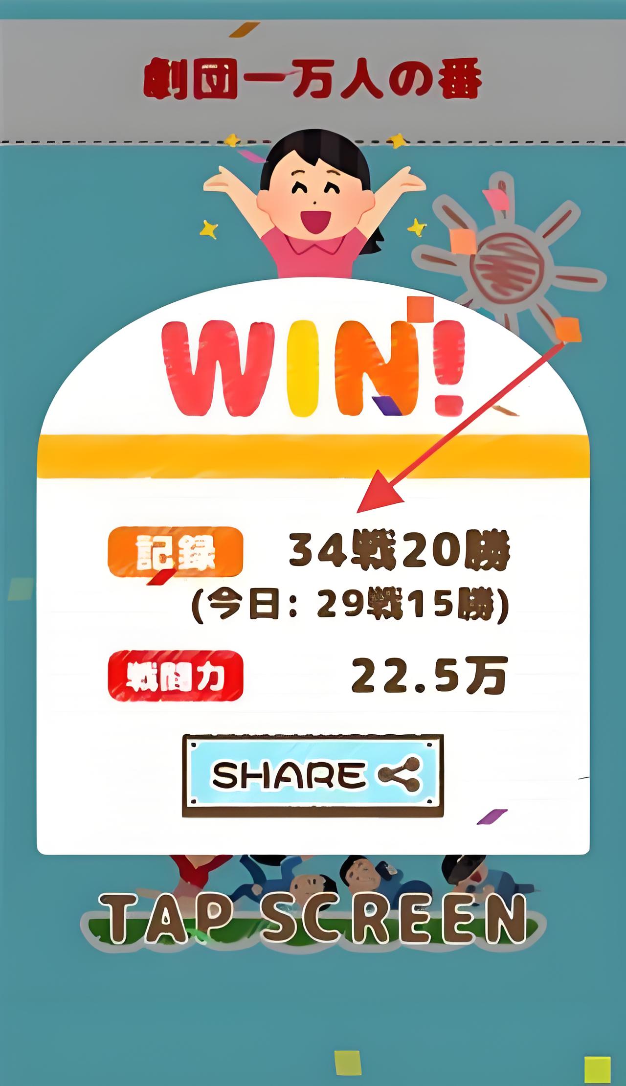 3、成功完成叠塔,显示【WIN!】,查看战绩(如34戦20勝),点击屏幕继续,开启新挑战。