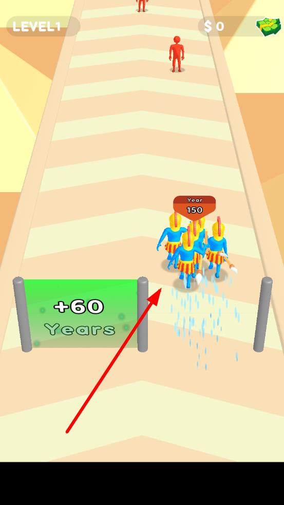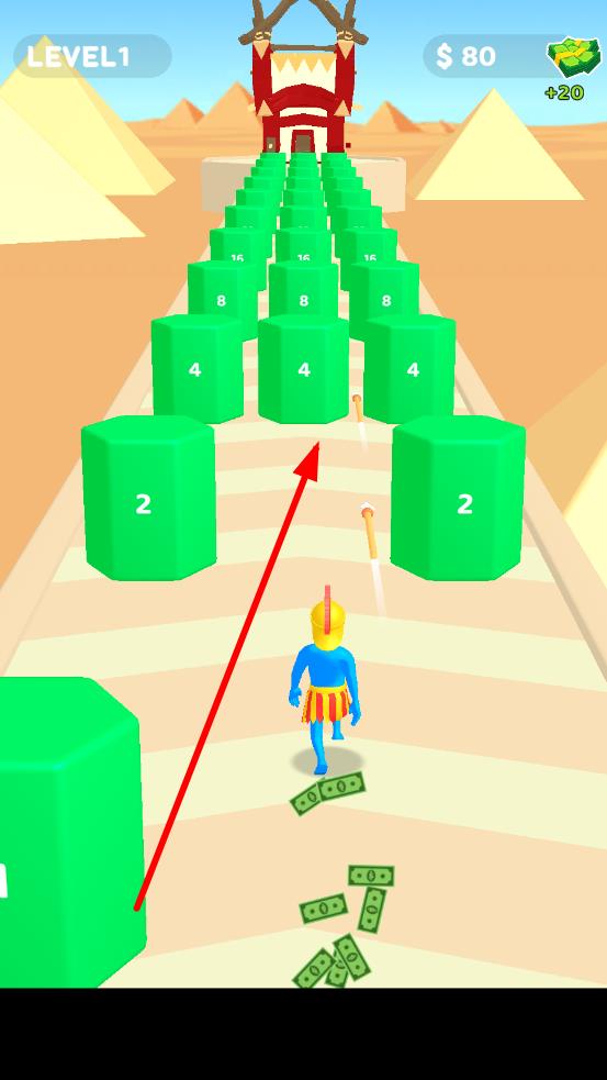 1、进入游戏后,在初始赛道控制小规模军队开始跑酷,拾取地面上的基础人数道具,让队伍人数初步增加,应对首个敌军小队。