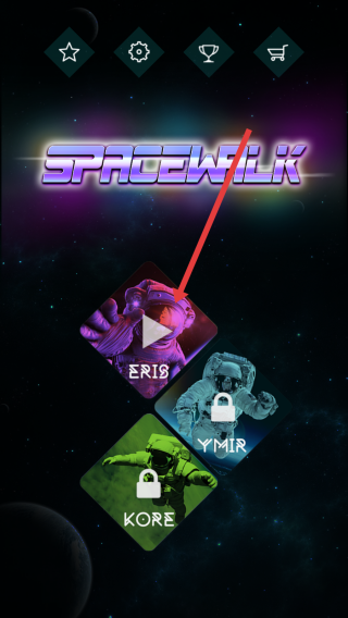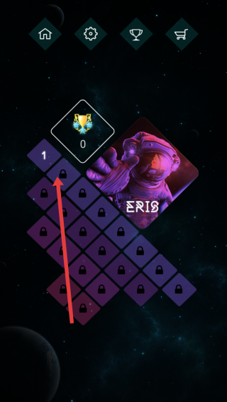 1、在主界面,选“ERIS”模式,进入关卡列表,点击“1”号关卡,开启太空行走冒险,挑战解谜。