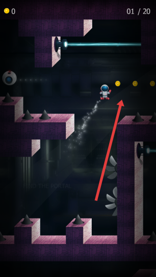 2、进入关卡后,操控宇航员,按箭头指引,躲避激光、尖刺等障碍,收集黄色道具,寻找传送门。
