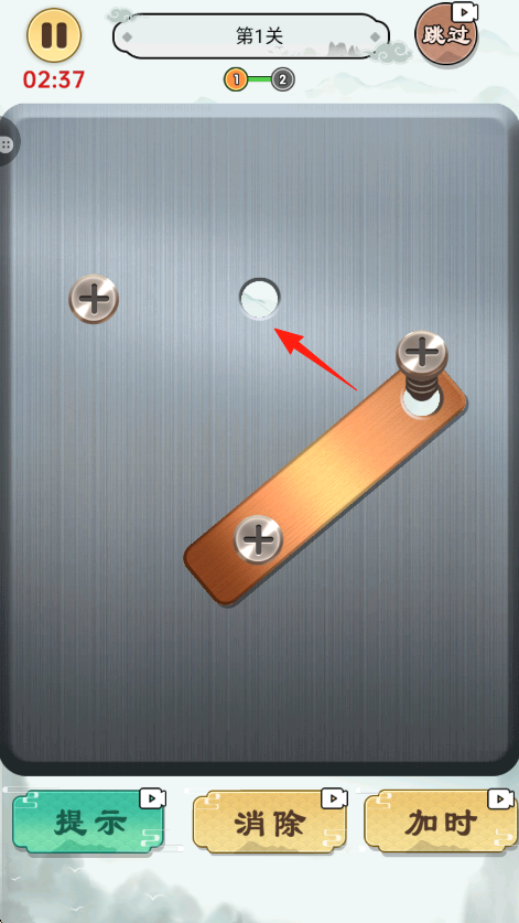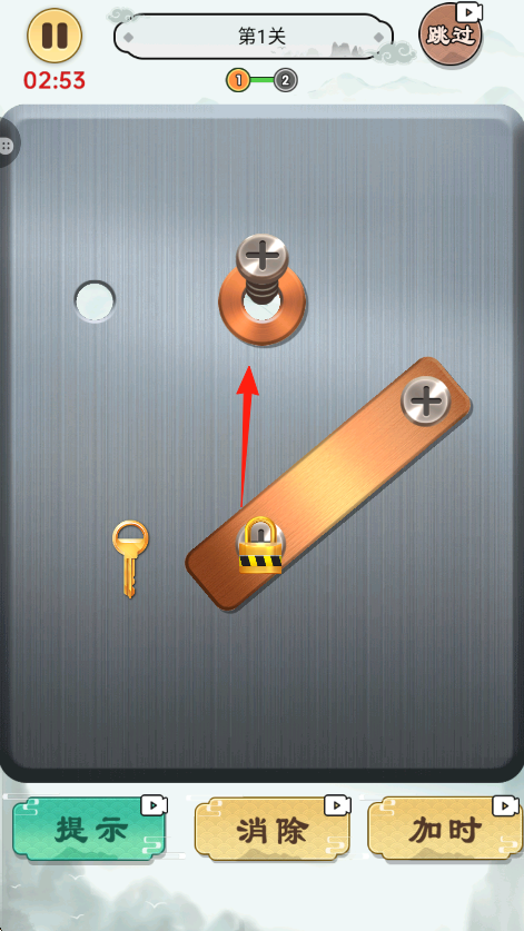 1、在第1关,点击箭头指向的螺丝,将其拧下,为后续操作创造条件。